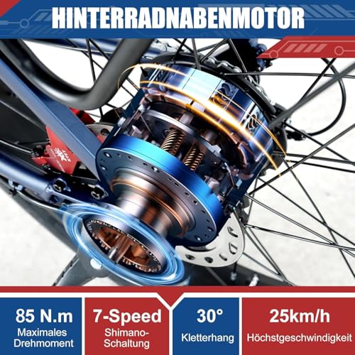 250W Nabenmotor & 30Ah Akku Das Electric bike Y26 ist mit einem 250W Nabenmotor und Drehmoment 85 N.m und die Höchstgeschwindigkeit kann 25 km/h erreichen (oder mehr Geschwindigkeit freischalten).Herausnehmbarer 48V 30Ah Lithiumakku von 𝐒𝐚𝐦𝐬𝐮𝐧𝐠 für einfaches Aufladen im Innenbereich. Zur gleichen Zeit mit 4A Ladegerät nur 8-10 Std, um den 30A Akku vollständig aufzuladen, und die Laufleistung kann 100-180 km betragen (Hängt von den Straßenbedingungen und dem Fahrergewicht ab)