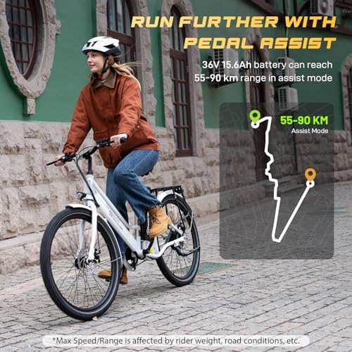 LEISTUNGSSTARKER MOTOR & AKKU: Das Elektrofahrrad EK8 für Erwachsene verfügt über einen 250W stronger Motor, der eine Höchstgeschwindigkeit von bis zu 25km/h erreicht. Mit einem austauschbaren 36V 15,6Ah Lithium-Ionen Akku, der in 5 Stunden vollständig aufgeladen ist, kann dieses E-Bike mit Pedal Assist 55–90km zurücklegen. Ihr Bergabenteuer und Ihre tägliche Fahrt werden schneller und kosteneffizienter.