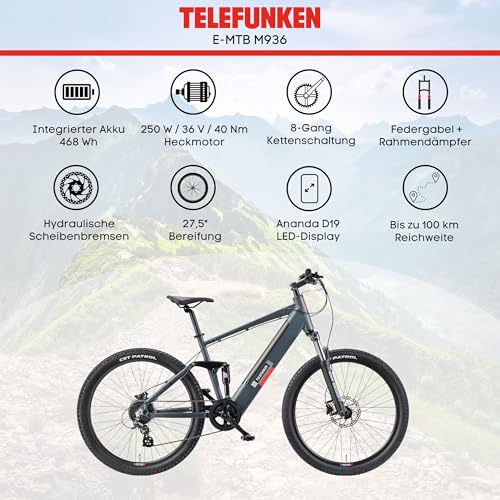 TELEFUNKEN E-Bike 27,5 Zoll Fahrrad für Damen & Herren | Pedelec Mountainbike mit 8- oder 24-Gang Kettenschaltung | Elektrofahrrad 250 W Heckmotor | 468 Wh / 504 Wh Li-Ion Akku | MTB Fully Ebike
