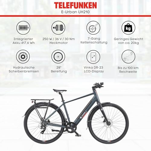 TELEFUNKEN E-Bike 28 Zoll Fahrrad für Damen & Herren | Pedelec Urban Citybike 7-Gang Kettenschaltung | Hydr. Scheibenbremsen | inkl. Panzerschloss | Elektrofahrrad 250 W Heckmotor und Li-Ion-Akku